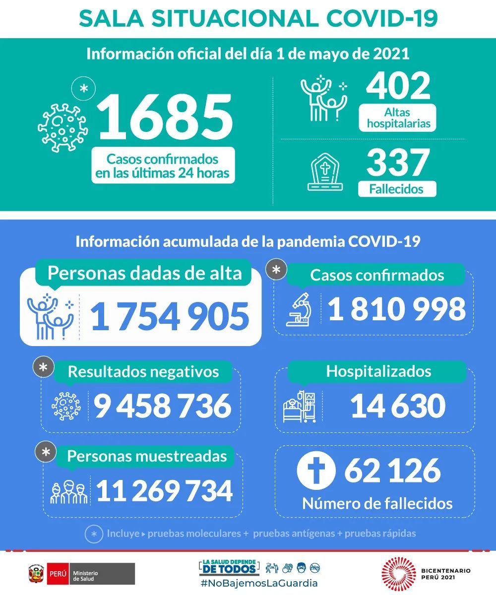 秘鲁卫生部5月2日发布的新冠疫情数据显示,与前一日报告相比,新增新冠肺炎确诊病例6083例,其中过去24小时新增病例为1685例,累计确诊病例达到1810998例;单日新增死亡病例337例,累计死亡62126例。目前仍有14630人住院,已有1754905人康复。
